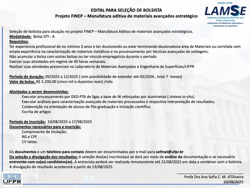Estão abertas inscrições para seleção de bolsista nÃvel DTI-1A para a última etapa do projeto FINEP – Manufatura Aditiva de Materiais Avançados Estratégicos